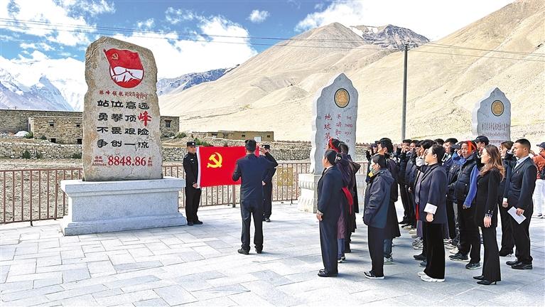 圖為聯(lián)創(chuàng)共建活動中,20余名黨員在“珠峰領(lǐng)航”石碑前重溫入黨誓詞。記者 索朗瓊珠 攝