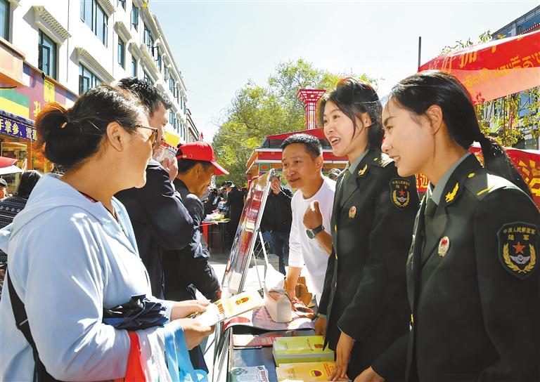 圖為9月16日上午,相關(guān)單位工作人員在拉薩宇拓路街頭為過(guò)往群眾講解國(guó)防安全知識(shí)。記者 旦增蘭澤 攝