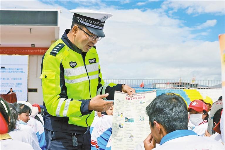 圖為交警向?qū)W生講解道路交通安全知識。記者 旦增嘎瓦 攝