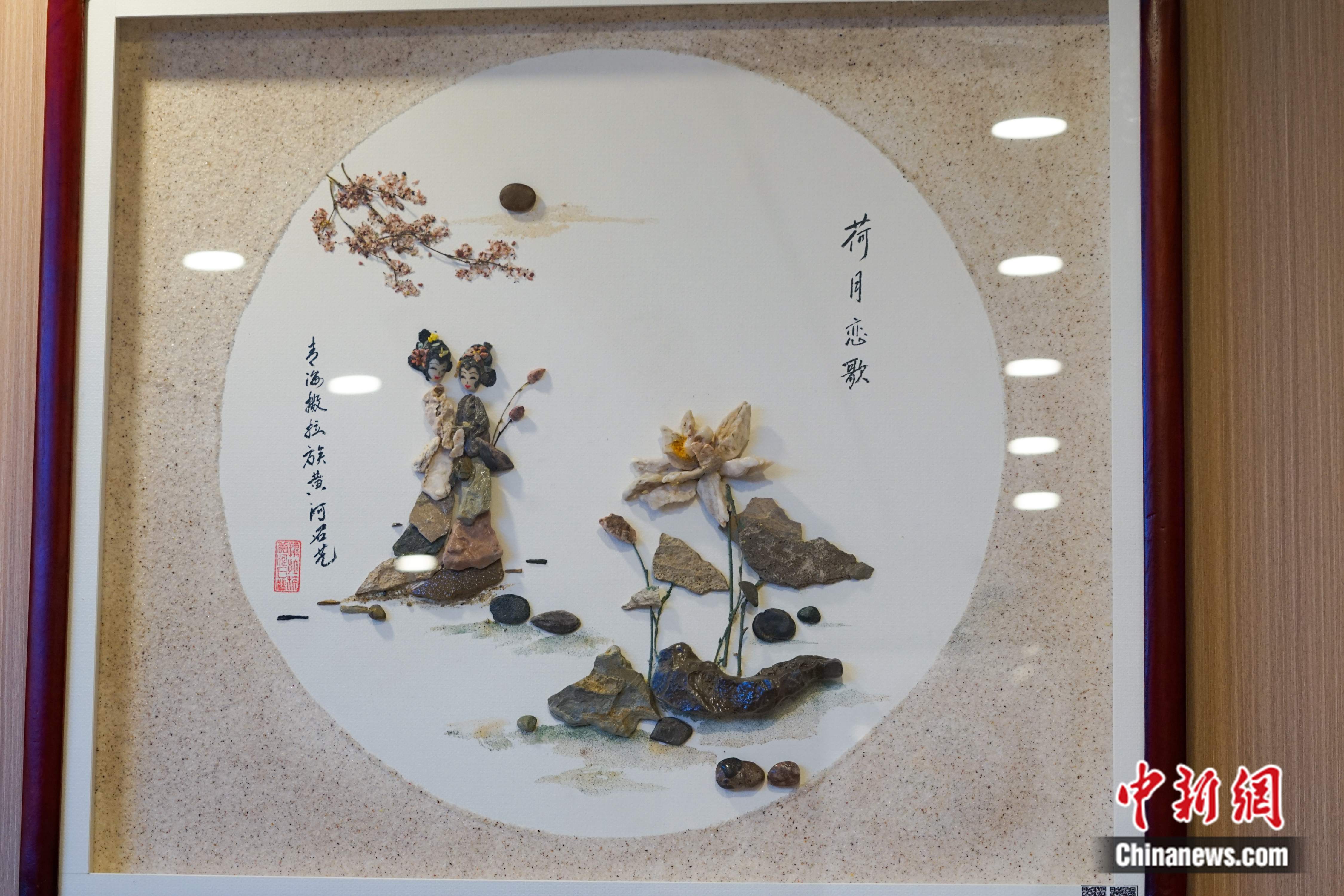 墻上懸掛的青海省民族團結進步形象標識,由多種少數(shù)民族刺繡共同制作而成;撒拉族婦女純手工制作的黃河石藝畫色調古雅、未經(jīng)雕琢,畫面呈現(xiàn)天然立體感,意境悠遠朦朧。