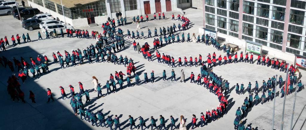 西藏阿里措勤縣中學(xué)的學(xué)生們正在跳“磁石彈舞”(無(wú)人機(jī)照片,11月13日攝)新華社記者 聶毅 攝