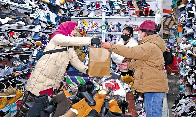 圖為在拉薩市城關(guān)區(qū)策門林社區(qū)回族店主蘇珊(左一)正在與藏族顧客交流。 記者 唐斌 攝