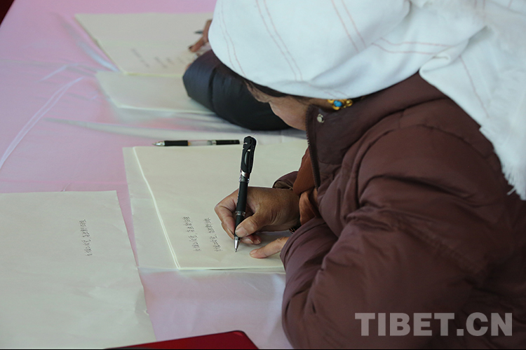 來自拉薩市當(dāng)雄縣羊八井鎮(zhèn)的仁青白姆在本次大比武中獲得了書法作品二等獎,她穿著一身極具當(dāng)雄特色的服飾參加今天的活動?!拔译m然沒上過學(xué),但平時忙完牧活,有機會就去上夜校學(xué)習(xí)藏語文和普通話等課程,也很喜歡利用閑暇時間在家里練習(xí)藏文書法,沒想到這次能夠獲獎,這是一份榮譽,也是一份鼓勵,我會繼續(xù)堅持學(xué)習(xí)。”仁青白姆臉上露出甜美微笑。