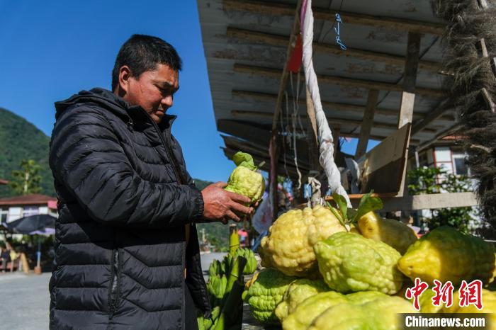 12月19日,48歲的門巴族次仁旺加在家門口馬路邊碼放大檸檬,這些墨脫特產(chǎn)主要向路過的游客銷售。中新社記者 江飛波 攝