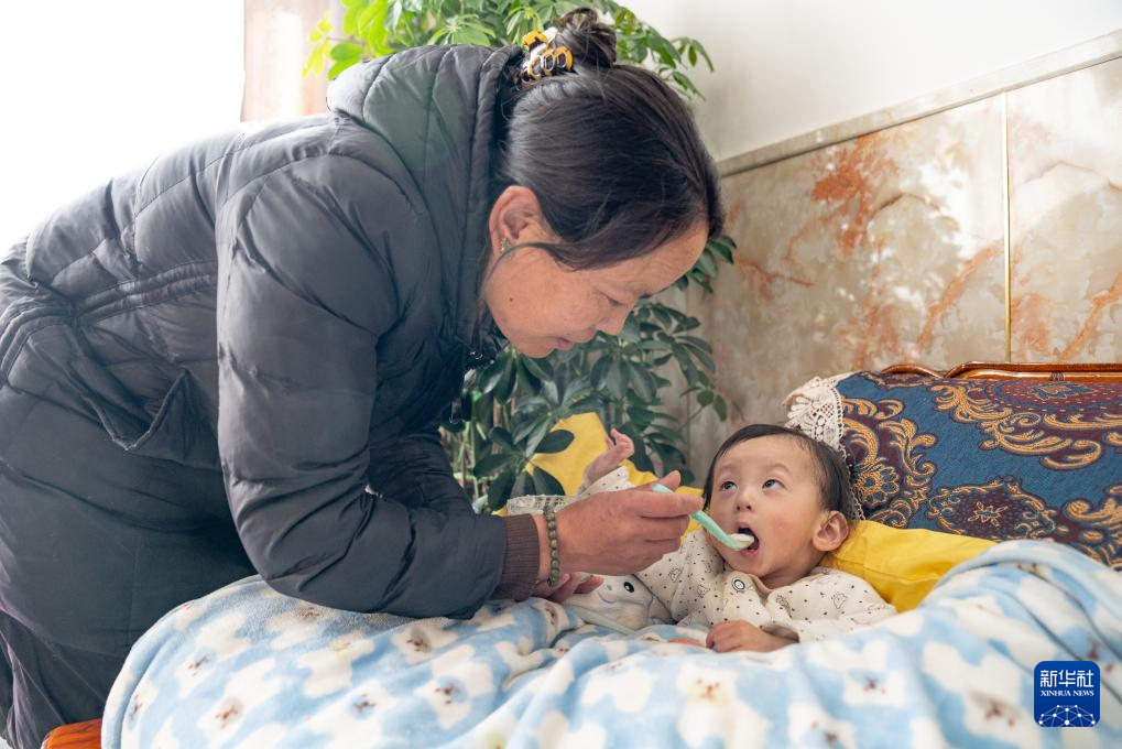 1月8日,巴桑在給一歲半的拉巴扎西喂飯。新華社發(fā)(丁增尼達(dá)攝)
