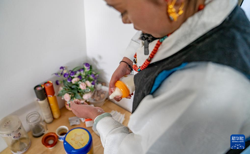 1月8日,旦增卓瑪給孩子沖奶粉時(shí)試溫。新華社發(fā)(丁增尼達(dá)攝)