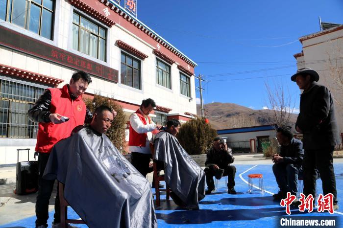 圖為理發(fā)店店長劉陽(左一)為民眾提供免費(fèi)理發(fā)服務(wù)。倫珠澤仁攝