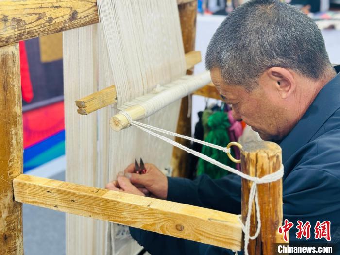 圖為國(guó)家鄉(xiāng)村工匠名師現(xiàn)場(chǎng)編織藏毯。中新網(wǎng)記者 孫睿 攝