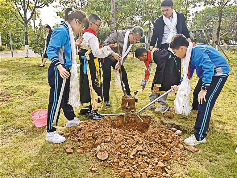 圖為“莞宜情·山海行”莞宜各族青年互訪交流活動(dòng)中,東莞、巴宜兩地青少年共同種下團(tuán)結(jié)之樹。