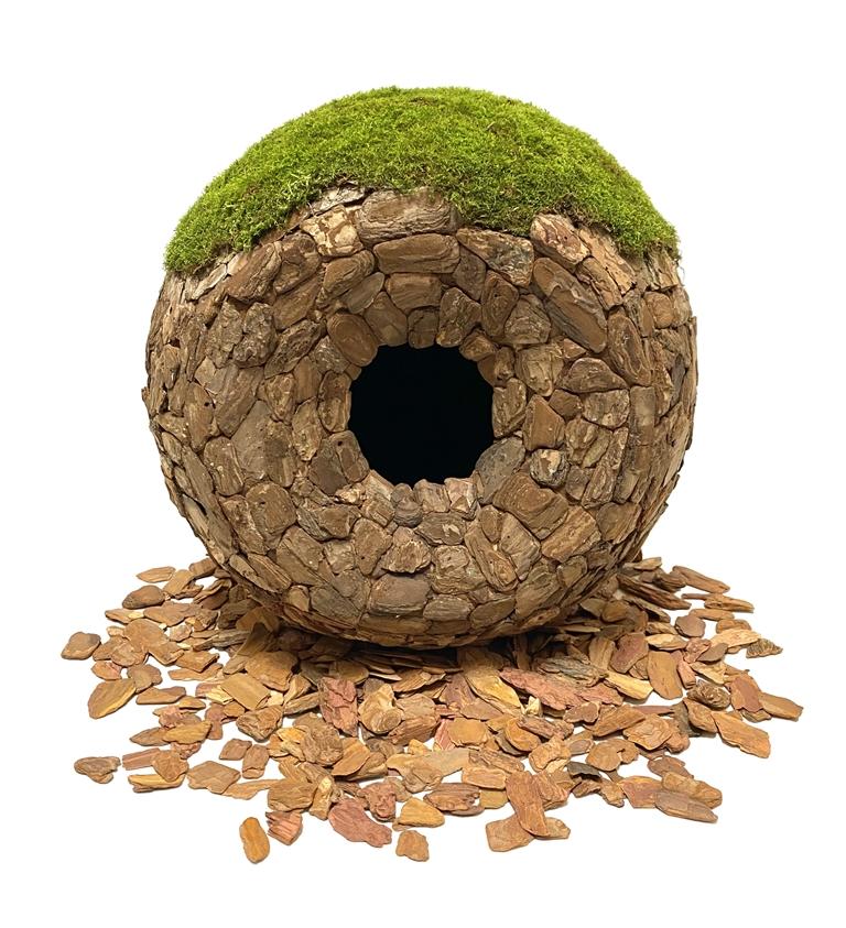 嘎瑪次仁的作品聚焦生態(tài)環(huán)境,作品《意象·自然》,是對(duì)“自然”理解的一種概念性的抽象表達(dá)。其形式上為一個(gè)中空球形裝置,表面為拼貼的樹皮,頂部種植有苔蘚。正面的部分區(qū)域內(nèi)陷,中間為一孔洞,為了更凸顯出洞中的“黑暗”與“未知”,內(nèi)部涂有特殊啞光涂料。為了體現(xiàn)出“生命感”,他在作品內(nèi)部安裝了感應(yīng)發(fā)聲裝置,感知到人靠近后會(huì)發(fā)出輕微的心跳聲。