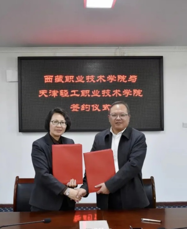 李云梅表示,天津輕工職業(yè)技術(shù)學(xué)院高度重視與西部院校開展合作,此前學(xué)院已與新疆和田、西藏昌都等地區(qū)職業(yè)院校建立了良好的合作關(guān)系并取得了豐碩的成果。天津輕工職業(yè)技術(shù)學(xué)院與西藏職業(yè)技術(shù)學(xué)院同為全國新能源行業(yè)產(chǎn)教融合共同體成員單位,具有良好的合作基礎(chǔ),希望通過此次《合作協(xié)議》的簽署和實施,進(jìn)一步整合學(xué)校資源,在天津輕工職業(yè)技術(shù)學(xué)院新能源等優(yōu)勢領(lǐng)域,集中力量為西藏職業(yè)技術(shù)學(xué)院提供支持,兩校攜手共同譜寫東西部院校合作新篇章。西藏職業(yè)技術(shù)學(xué)院黨委副書記、院長陳飛對天津輕工職業(yè)技術(shù)學(xué)院在東西部院校合作中作出的積極貢獻(xiàn)表示感謝,表示以此次簽約為契機(jī),共同推動兩校在多個領(lǐng)域交流合作、協(xié)同發(fā)力,共同推動協(xié)議內(nèi)容走深走實,促進(jìn)自治區(qū)高等職業(yè)教育高質(zhì)量發(fā)展。