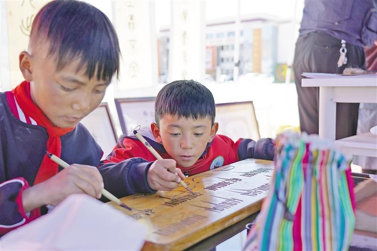 在阿里地區(qū)“文化和自然遺產(chǎn)日”活動(dòng)中,小朋友學(xué)習(xí)藏文書法。記者 達(dá)珍 洛桑旦增 攝