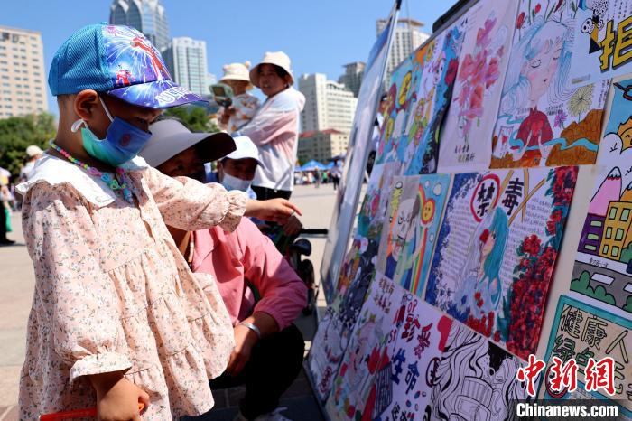 圖為小朋友和家長(zhǎng)觀看禁毒知識(shí)手繪。薛蒂 攝