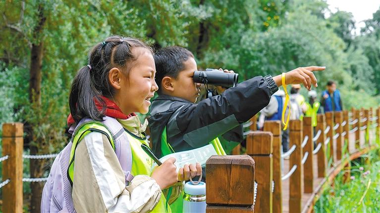 圖為小朋友在國(guó)家級(jí)自然保護(hù)區(qū)拉魯濕地觀察花草、鳥(niǎo)類。記者 鹿麗娟 攝