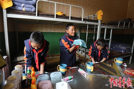 9月14日,西藏那曲市班戈縣第二(中石化)小學,學生們午休后在宿舍里洗漱。部分離家較遠的學生,可以選擇讀書期間全程住校,生活起居都有專門的老師照顧。中青報·中青網(wǎng)記者 孔斯琪 攝