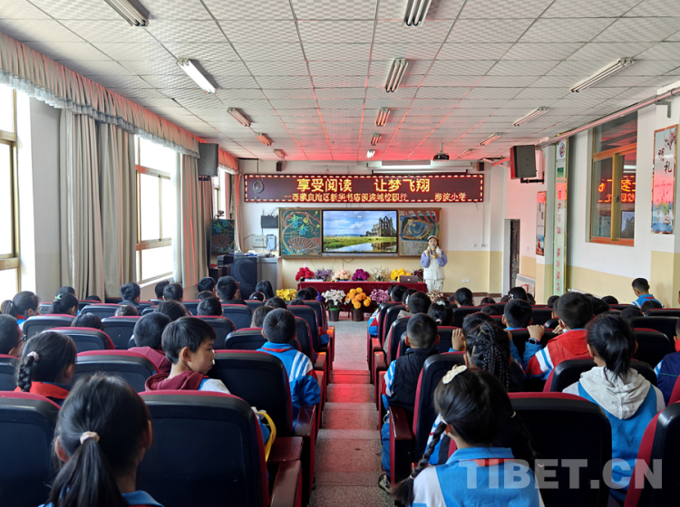 圖為4月23日,西藏自治區(qū)新華書店在拉薩市城關(guān)區(qū)海淀小學開展的“享受閱讀讓夢飛翔”閱讀校園行活動現(xiàn)場?;顒友埩俗骷依钗粝?qū)W生們分享人與動物、人與自然的故事 攝影:次旦拉姆