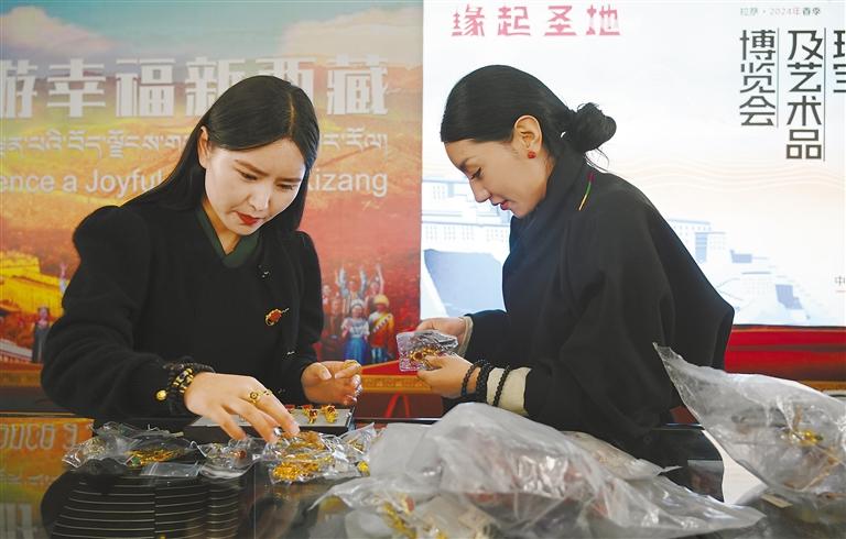 4月24日,2024年春季中國西藏珠寶及藝術品博覽會在自治區(qū)會展中心開幕。博覽會現(xiàn)場熱鬧非凡,許多市民游客前來參觀、選購商品,共同感受西藏文化的獨特魅力。 圖為參展商在整理展位上的商品。 記者 王敏 攝