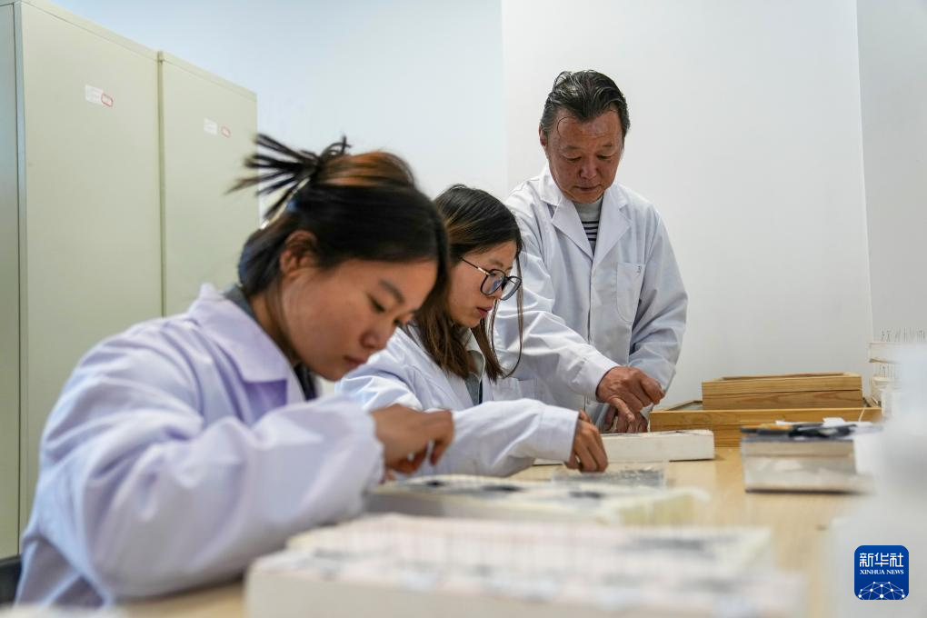在位于拉薩的西藏自治區(qū)高原生物研究所,達(dá)娃(右)和同事查看采集到的昆蟲標(biāo)本(4月22日攝)。新華社記者 晉美多吉 攝