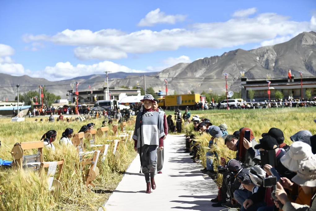 田野間,新開辟出的一條上百米的S形秀道婉轉(zhuǎn)綿延。隨著富有節(jié)奏感的音樂響起,身著氆氌藏族服飾的模特款款走來,一旁,30位藏族“阿佳”坐在編織機(jī)前熟練地捻織著氆氌手工品。