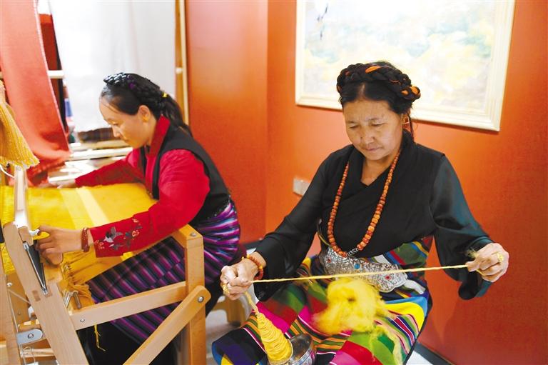 圖為“阿佳格桑工坊”的阿佳們在制作氆氌。 記者 王敏 攝