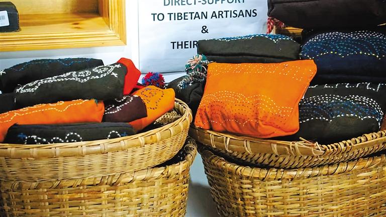 記者來到位于拉薩市八廓街內(nèi)的卓番林,一件件色澤鮮艷、美觀精致的編織物品呈現(xiàn)在眼前。毛毯、錢包、單肩包、抱枕等物品,融入了傳統(tǒng)的氆氌花紋和編織方式,加上獨(dú)特的花紋和設(shè)計,不僅保留了西藏文化的精髓,還賦予了產(chǎn)品新的活力。