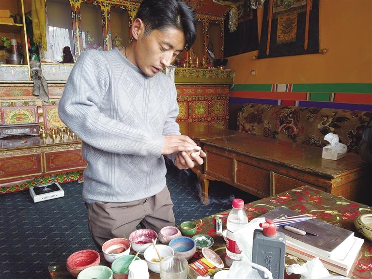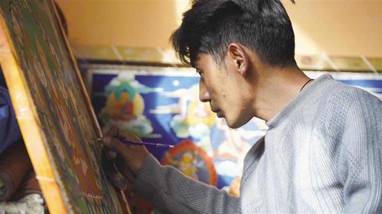 屋內(nèi),是他伏案繪制唐卡的專注身影;身旁,是父母欣慰的目光與陪伴?!白詮膶W(xué)會了唐卡繪畫后,我一直在拉薩就業(yè)謀生,但由于家里有年邁的父母需要照顧,我就回到家里一邊照顧父母,一邊繪畫定制的唐卡。這樣不僅有穩(wěn)定的收入,還能像其他人一樣靠自己的雙手過上幸福的生活。”尼瑪次仁激動(dòng)地告訴記者,他的話語中充滿了對生活的感恩和對未來的信心。