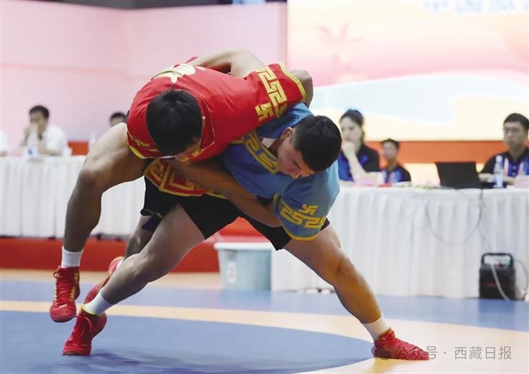 民族式摔跤運(yùn)動(dòng)員益西多吉正在參加北嘎87公斤級(jí)摔跤比賽。