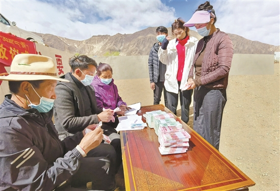 圖為康樂小區(qū)易地扶貧搬遷群眾勞務費發(fā)放現(xiàn)場。 拉薩融媒記者 喬 梁攝
