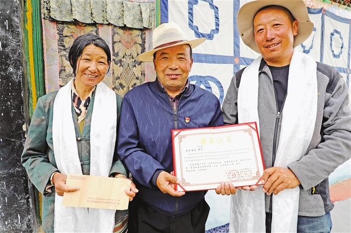 那嘎村黨委書(shū)記嘎瑪扎西(中)為脫貧戶次仁達(dá)瓦一家頒發(fā)榮譽(yù)證書(shū)。