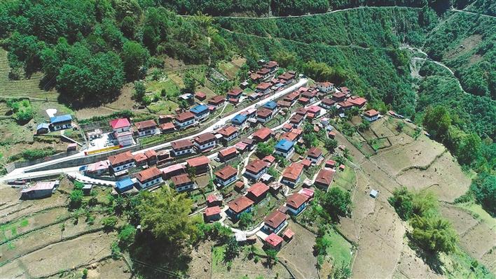 從公路上遠(yuǎn)眺西藏自治區(qū)阿里地區(qū)日土縣日松鄉(xiāng)甲崗村,只見(jiàn)一大片紅檐白墻的兩層居民房矗立在綠中帶黃的草原上,家家戶戶屋頂都插著五星紅旗,迎風(fēng)招展、格外鮮艷。