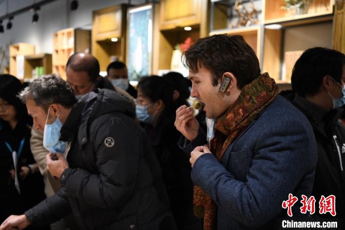 圖為中外嘉賓觀摩隴南市油橄欖產(chǎn)業(yè)時(shí),品嘗加工后的油橄欖果。 閆姣 攝