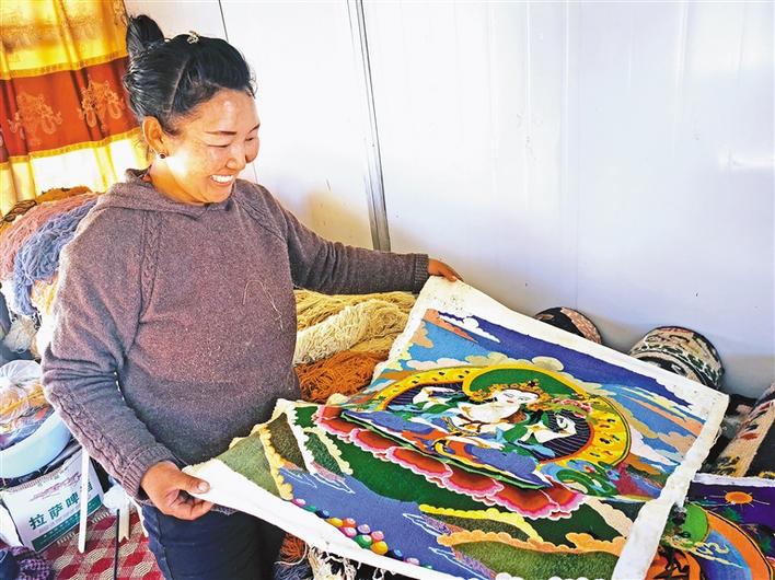 圖為西藏日喀則市易地扶貧搬遷點群眾展示自己的藏繡作品。記者 王莉 通訊員 德吉央宗 攝
