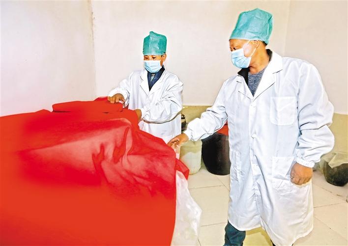 圖為山南市隆子縣扎日鄉(xiāng)藏白酒加工廠工作人員在查看儲(chǔ)藏的白酒。記者 洛桑 群培 攝
