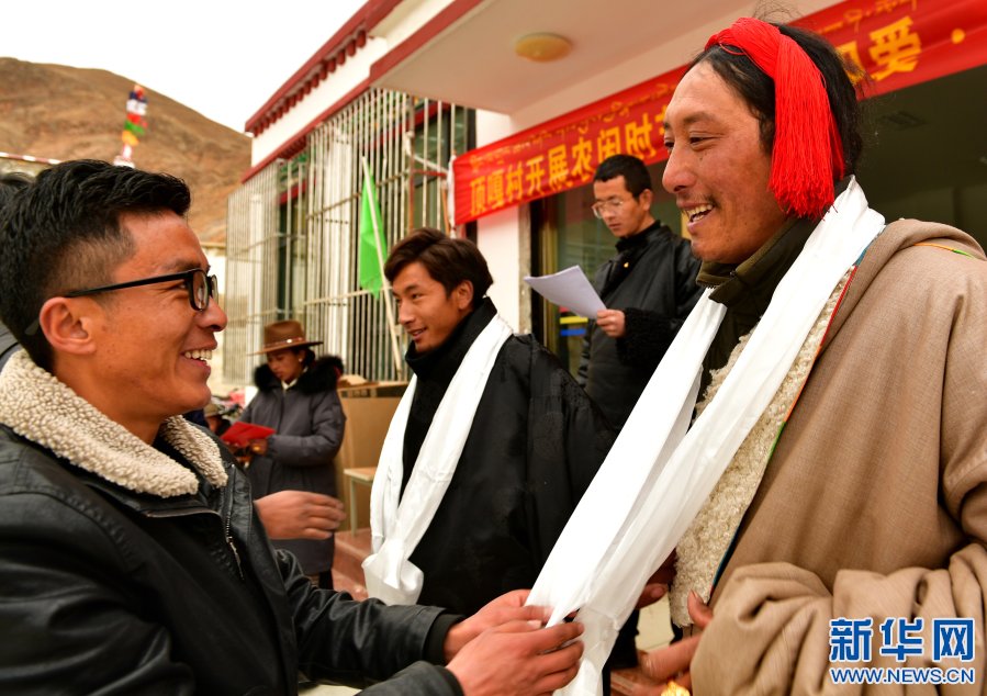 西藏拉薩市堆龍德慶區(qū)德慶鄉(xiāng)頂嘎村駐村第一書(shū)記扎西達(dá)杰(左)為參加文娛活動(dòng)的獲獎(jiǎng)村民頒獎(jiǎng)并佩戴哈達(dá)(2019年2月28日攝)。新華社記者 張汝鋒 攝