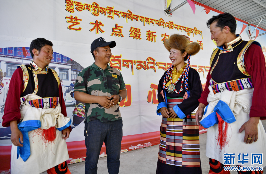 西藏山南市扎囊縣桑耶鎮(zhèn)乃卡村第一書(shū)記、駐村工作隊(duì)隊(duì)長(zhǎng)次仁羅布(左二)和村文藝演出隊(duì)演員交流(2020年7月7日攝)。新華社記者 張汝鋒 攝
