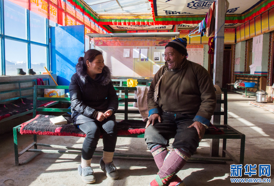 西藏山南市浪卡子縣堆瓦村,35歲的駐村干部貢曲(左),向60歲的堆瓦村村民索朗扎西了解生活情況(2017年2月9日攝)。新華社記者 普布扎西 攝