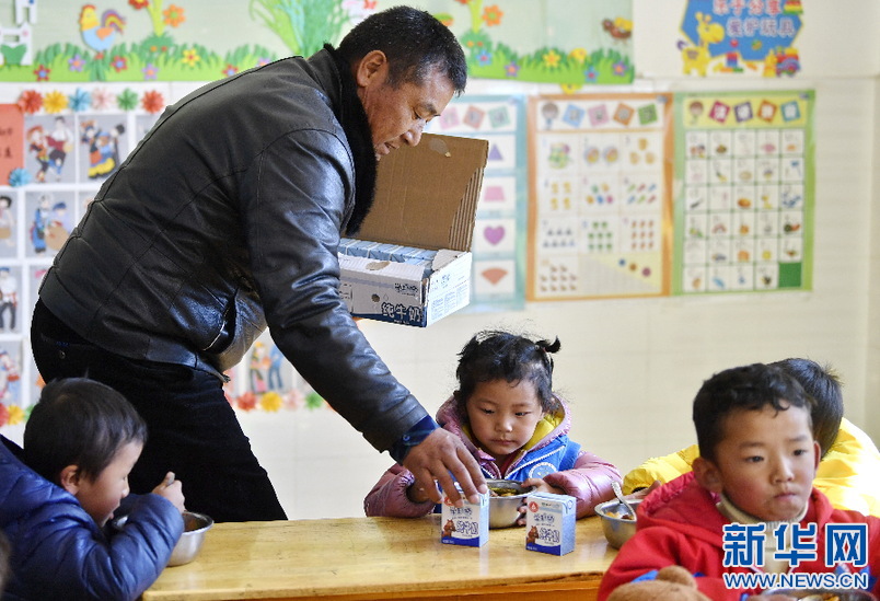 西藏山南市貢嘎縣吉雄鎮(zhèn)紅星社區(qū)雙語(yǔ)幼兒園的老師為孩子們分發(fā)牛奶(11月25日攝)。新華社記者 張汝鋒 攝