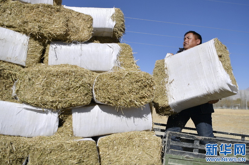 西藏山南市貢嘎縣吉雄鎮(zhèn)紅星社區(qū)致富帶頭人、奶牛養(yǎng)殖基地負(fù)責(zé)人邊巴碼放冬儲(chǔ)飼草(11月25日攝)。新華社記者 張汝鋒 攝