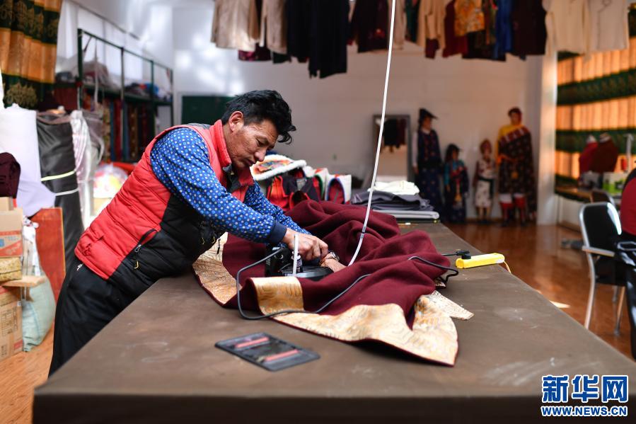 在西藏昌都市江達(dá)縣格?;褡宸椉庸やN售公司,江達(dá)縣字嘎鄉(xiāng)塔字村村民扎西江措在制作藏裝(4月30日攝)。扎西江措學(xué)習(xí)制作藏裝不到兩年時(shí)間,已經(jīng)是一名熟練的制衣工,現(xiàn)在每個月有4000多元的收入。新華社記者 詹彥 攝
