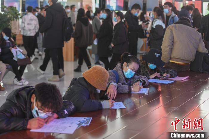 求職者在招聘會上填寫個人信息。 貢嘎來松 攝