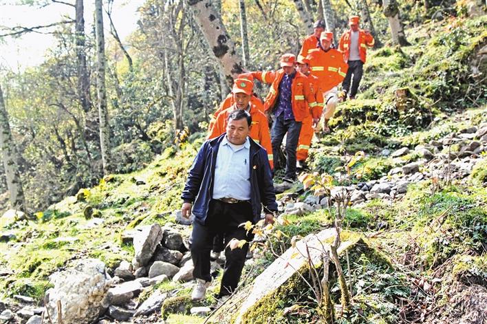 增巴帶領(lǐng)森林巡邏隊在林區(qū)巡山。記者 張斌 陳林 攝
