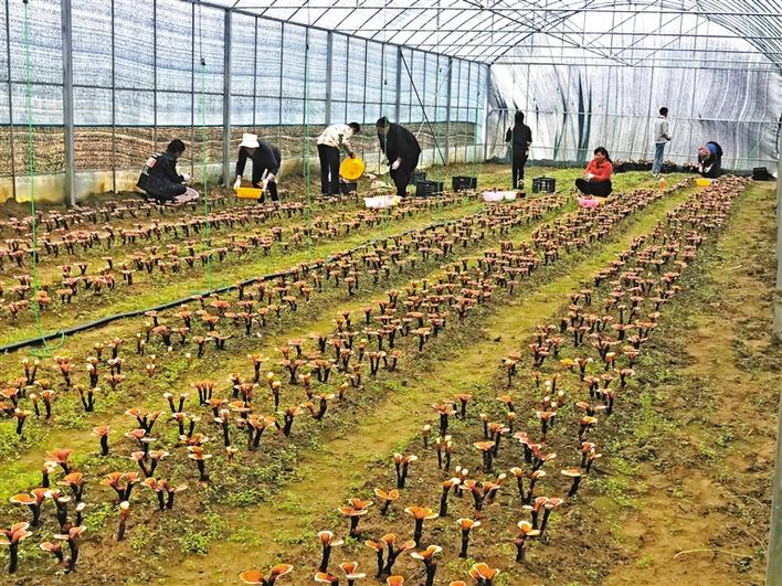 圖為紅太陽家庭農(nóng)場工作人員在采摘靈芝。 記者 措姆 攝