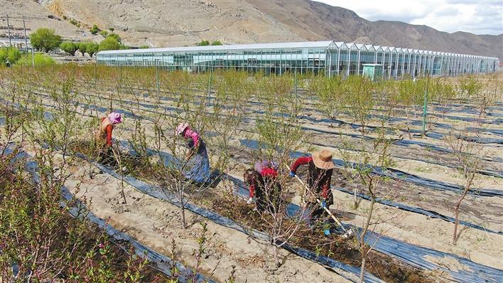 圖為當?shù)厝罕娫诳ㄈ玎l(xiāng)大桃種植基地里干農(nóng)活。記者 裴聰 格桑倫珠 攝