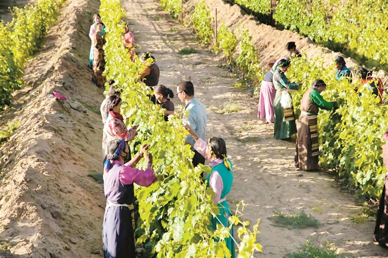 圖為曲水才納凈土健康產(chǎn)業(yè)園內(nèi),當(dāng)?shù)剞r(nóng)牧民群眾正在葡萄種植基地內(nèi)忙碌。 拉薩融媒記者 王 雪攝