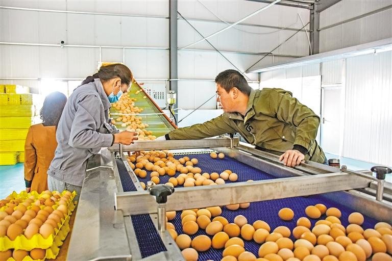 圖為就業(yè)群眾和技術(shù)員在西藏宏農(nóng)百萬(wàn)羽全智能化藏雞產(chǎn)業(yè)園的流水線上篩檢成品雞蛋。 記者 劉楓 攝