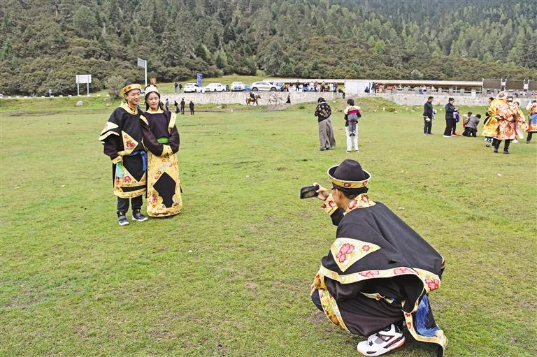 圖為來自廣東的游客身著工布服飾拍照留念。記者 胡文 攝