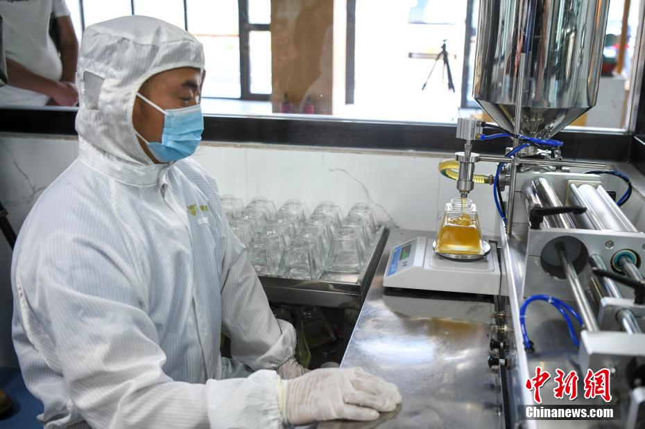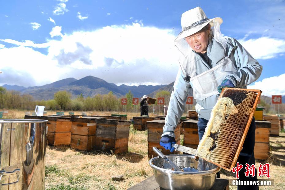 5月28日,在海拔3650米的西藏自治區(qū)山南市貢嘎縣巔峰貢蜜蜂巢一號(hào)綜合體的養(yǎng)蜂基地,工作人員正在取蜜。據(jù)悉,該地的巔峰貢蜜項(xiàng)目是湖南長(zhǎng)沙市第九批援藏工作隊(duì)牽頭孵化、推進(jìn)并建設(shè)壯大的全新項(xiàng)目。項(xiàng)目于2020年5月開始建設(shè),目前已經(jīng)完成蜂巢一號(hào)綜合體、透明工廠、陽(yáng)光餐廳以及八個(gè)蜜蜂養(yǎng)殖示范基地,帶動(dòng)藏族同胞就業(yè)358人,投產(chǎn)之后第一年銷售額達(dá)到800萬(wàn)元。圖為工作人員進(jìn)行取蜜。 楊華峰 攝