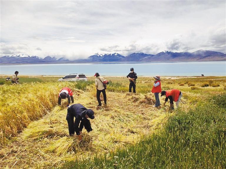 近日,日喀則市康馬縣公安局在統(tǒng)籌安排好工作的同時(shí),組織民輔警志愿者深入南尼鄉(xiāng)楚嘎村田間地頭,幫助缺勞力家庭開(kāi)展秋收。在豐收的田野上,民輔警志愿者分工明確,有的用背負(fù)式收割機(jī)收割,留下一排排青稞茬;有的將成熟的青稞捆扎,堆積成一排排青稞垛子,進(jìn)行晾曬;有的忙于收集青稞穗,不浪費(fèi)一粒糧食。