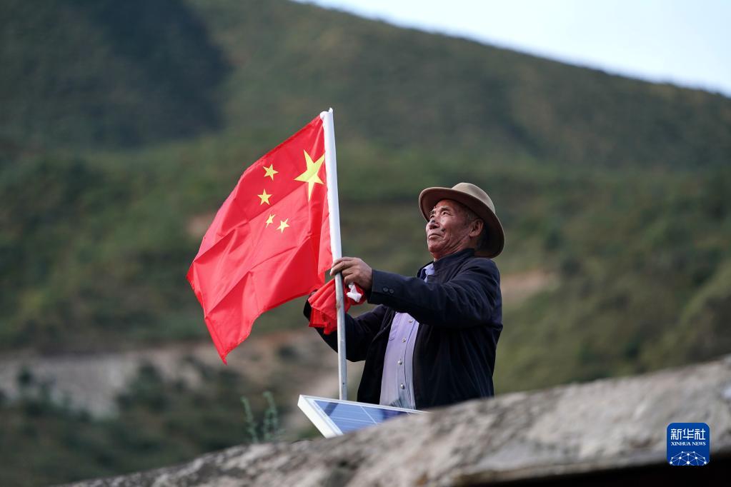 昌都市江達縣崗托村村民普巴在屋頂換上嶄新的國旗(2020年9月25日攝)。新華社記者 詹彥 攝