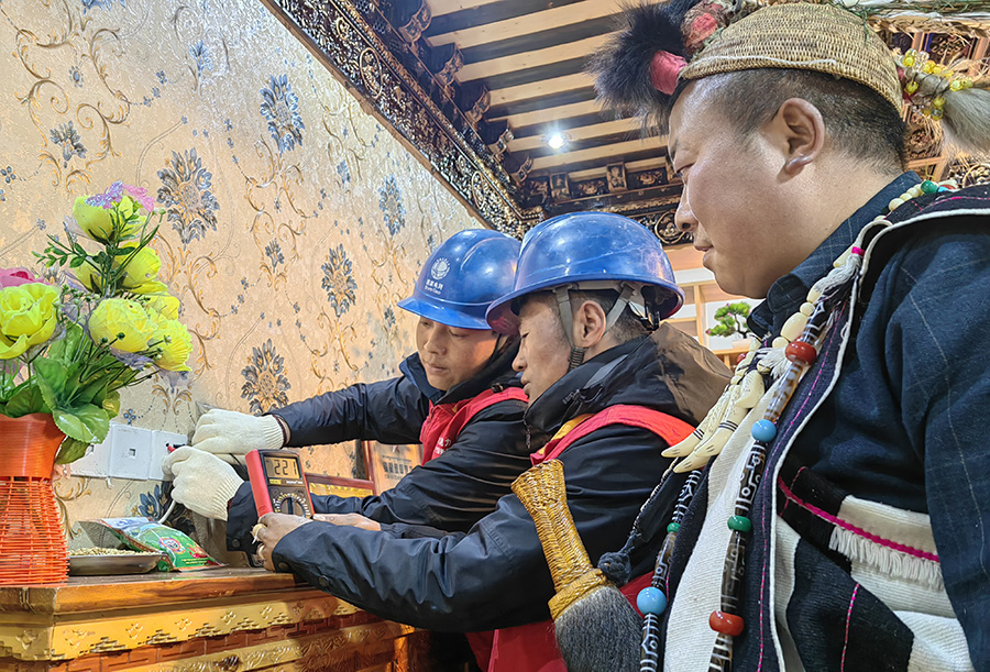 藏歷新年前,供電所服務班長索朗吾珠、班員云丹正在檢查家庭旅館的電源開關(2月19日攝)。國網(wǎng)西藏電力供圖 陶丹丹 攝